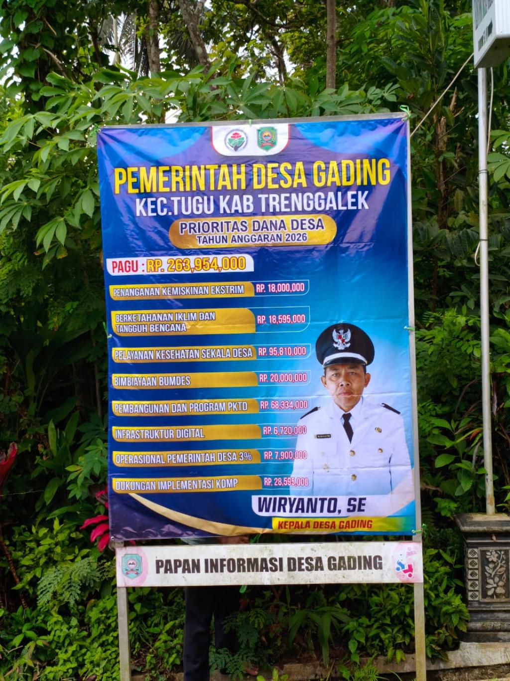 Menindaklanjuti ketentuan Pasal 10 ayat (1) Peraturan Menteri Desa dan Pembangunan Daerah Tertinggal Nomor 16 Tahun 2025 tentang Petunjuk Operasional Atas Fokus Penggunaan Dana Desa Tahun 2026, maka Pemerintah Desa Gading memasang baliho / website desa sebagai papan informasi desa yang dapat dilihat atau diakses langsung masyarakat.